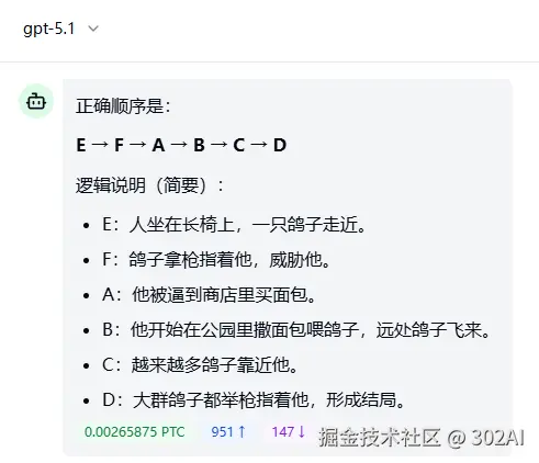 附 GPT-5.1 的回答,仅有B和C这两个容易混淆的图顺序错误,其他顺序排列正确,漫画内涵解读上已经非常接近原意了。