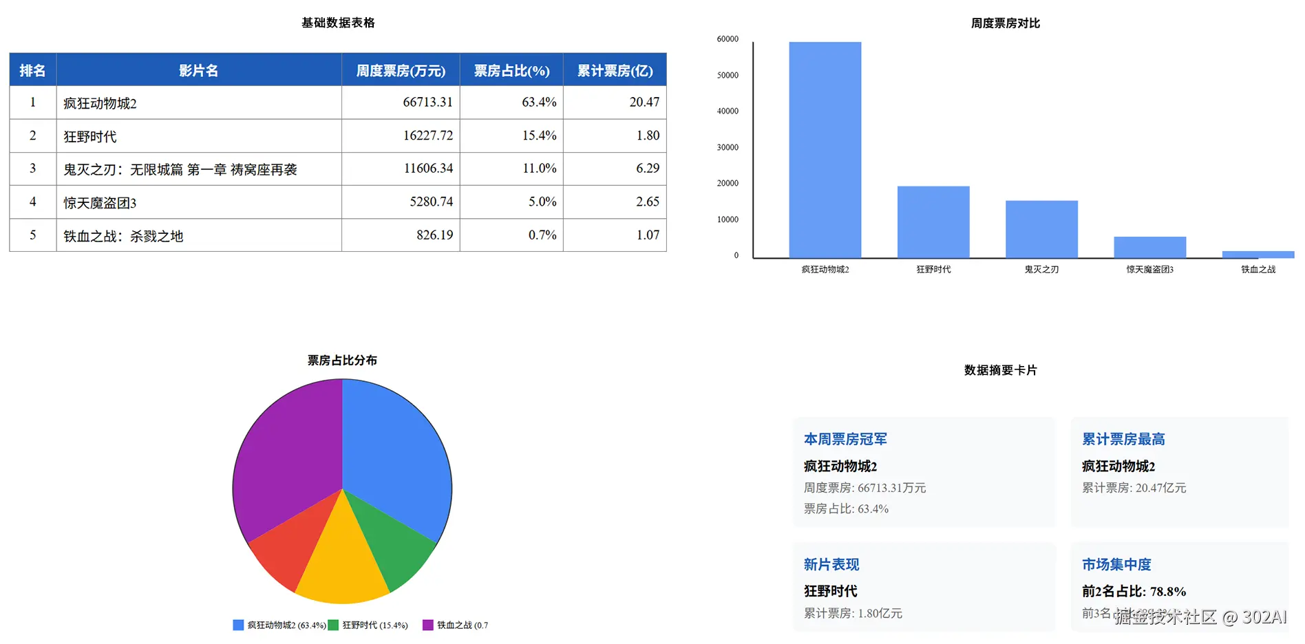 GLM-4.6V 准确提取信息后生成了对应的基础数据表格、票房占比饼状图、周度票房柱状图以及数据卡片,但是生成的饼状图存在明显数据错误。