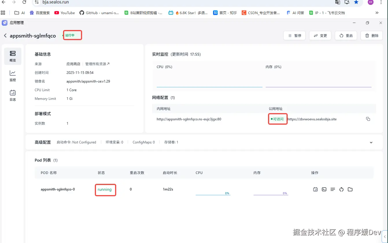 Sealos会自动处理所有的环境配置、端口映射和持久化存储。等待大约2-3分钟,当应用状态显示为绿色的 Running 时,部署就成功了。