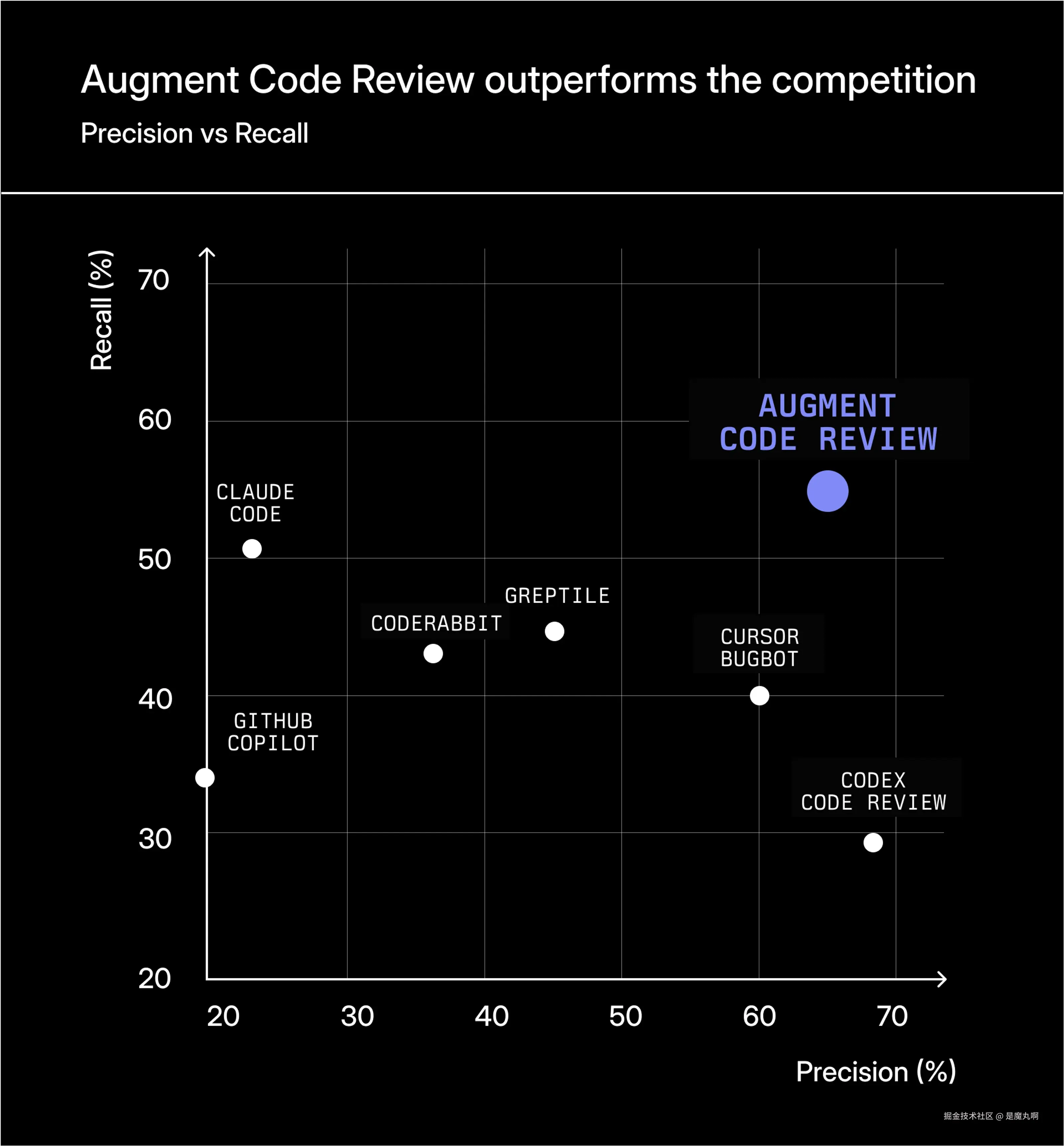 Augment 是唯一保持高精确度和高召回率的系统,因为它检索了深度推理所需的完整、正确的上下文。