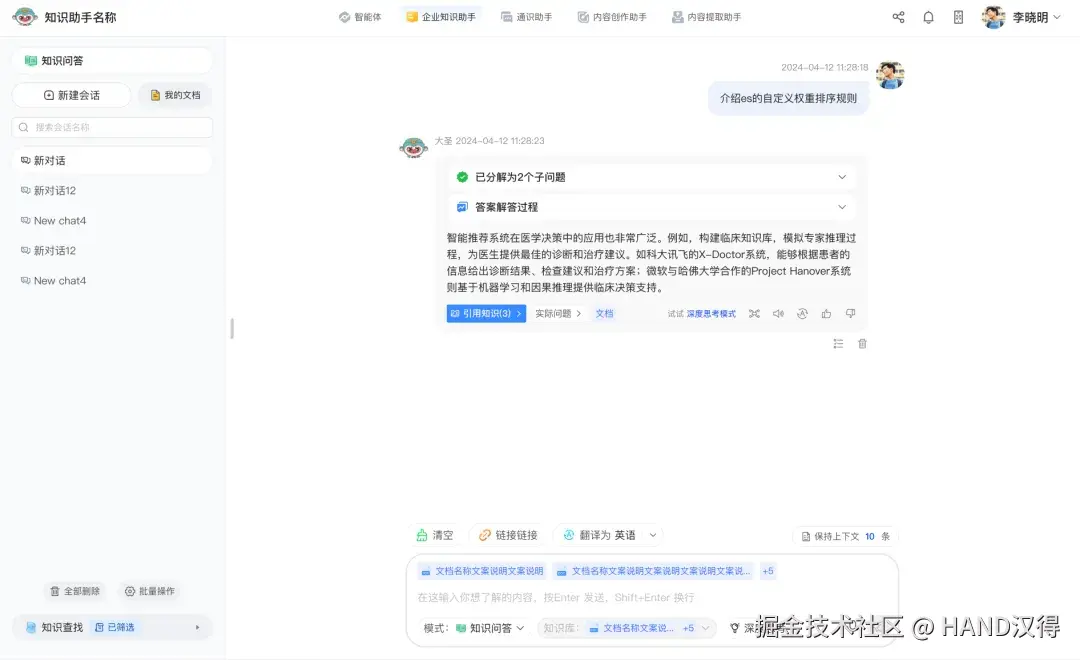 多会话管理功能为用户提供并行问答能力,每个会话都保持自己完整的历史记录和上下文语境,帮助用户随时回溯答案。用户可以在多个会话之间自如切换,处理不同业务问题,也无需重复描述问题。同时,会话也支持重命名、删除等操作。这种多会话功能避免了不同话题间的思路混淆,大大提升知识探讨的深度和广度。