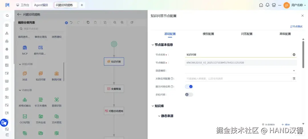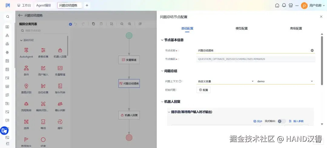问题总结节点 能够基于对话上下文和用户初始问题,自动对复杂问题进行归纳总结,无需用户手动填写提示词,即可输出简洁的要点,帮助用户快速把握重点,提升决策效率。