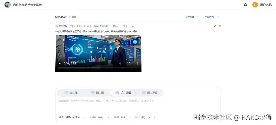 内容创作应用支持视频生成 内容创作应用在原有的“文生图、图生图”基础上,新增“文生视频”和“图生视频”,用户只需一句文字描述、或上传一张图片,就能自动生成动态视频内容,无论是用于活动宣传、产品展示还是创意动画,都能轻松完成,大大提升效率与表现力。