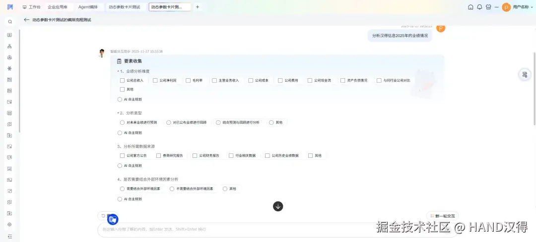 动态收集节点 能够在用户提出初步问题后,使Agent主动追问细节来精准把握用户需求,并即时将抽象需求转化为可视化的选项卡片,用户无需手动输入,轻松一点即可完成信息补充。