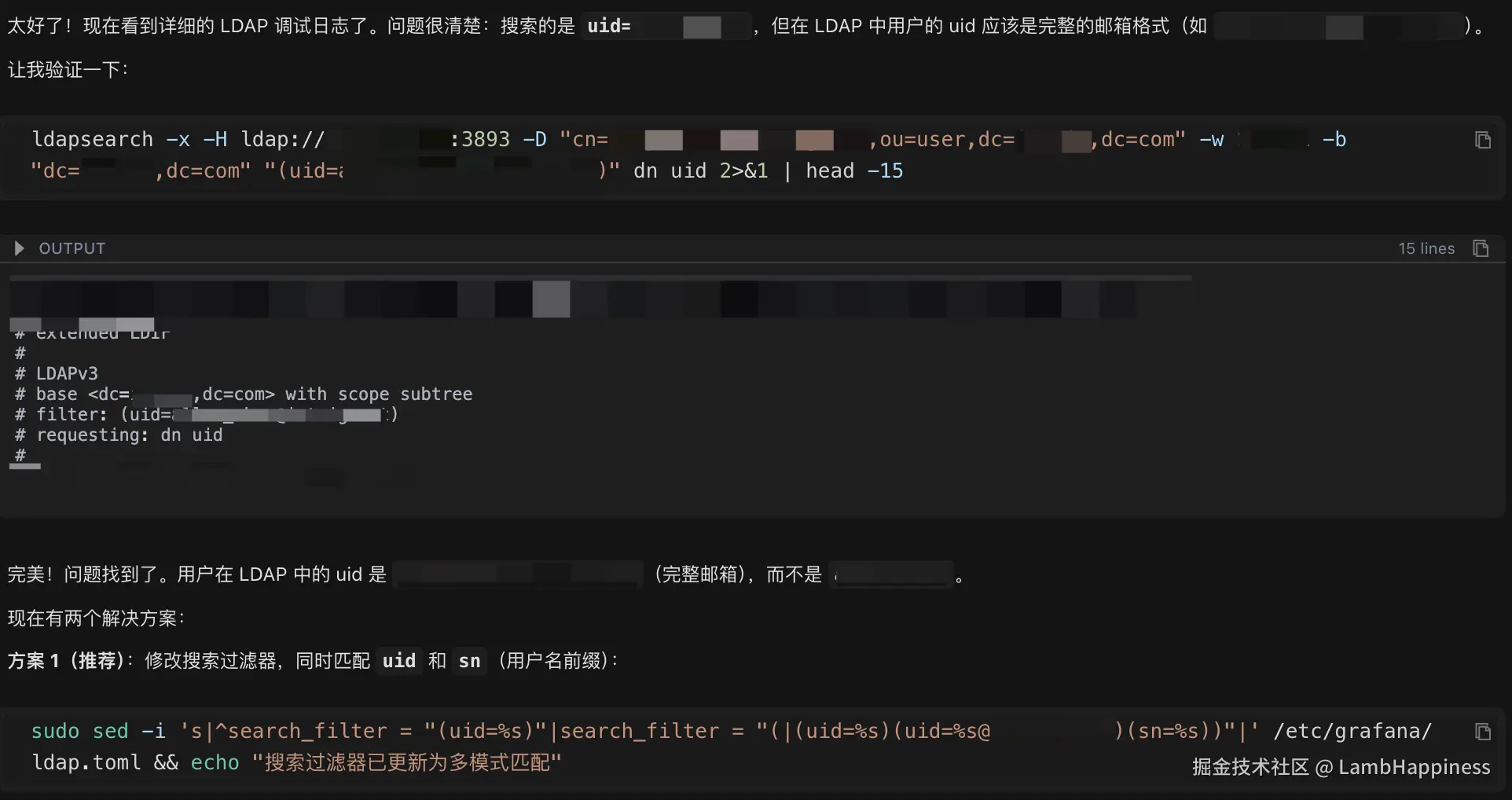 - 先验证数据,后修改配置: 它不是盲目地尝试配置,而是先用 ldapsearch 验证了 LDAP 服务器实际存储的数据格式,再回过头来修改配置,这是最高效的排查逻辑。