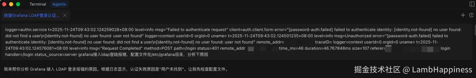 日志显示找不到 ldap 用户,小丰立刻开始了标准排查流程: