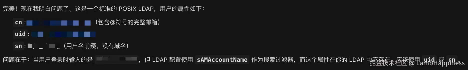 sAMAccountName属性去找(但这个属性不存在) - LDAP 中实际存储的是
