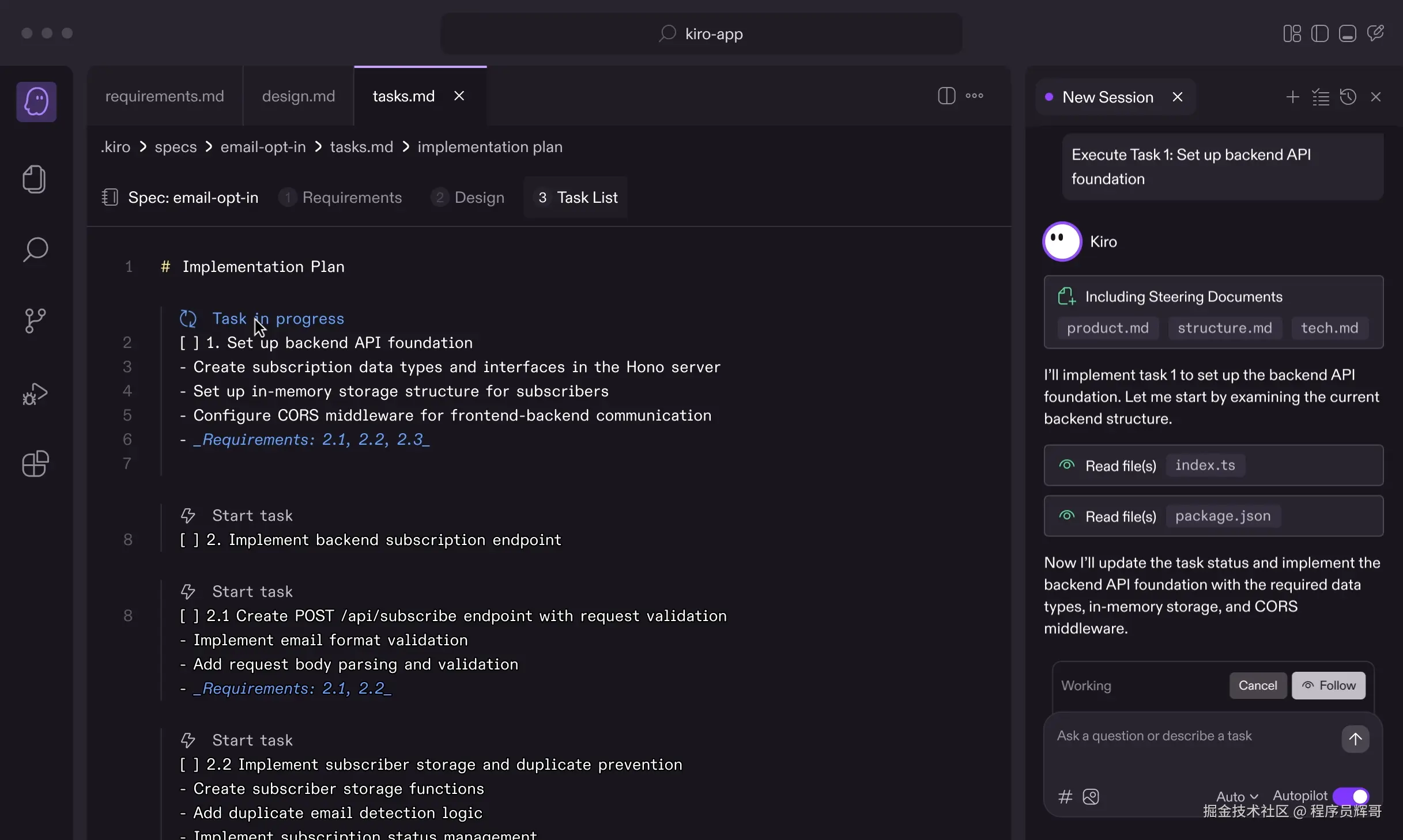 对于Spec Coding的使用,我强烈推荐使用AWS的Kiro,提供了最完整的 Spec 驱动开发流程,并且有很友好的交互体验