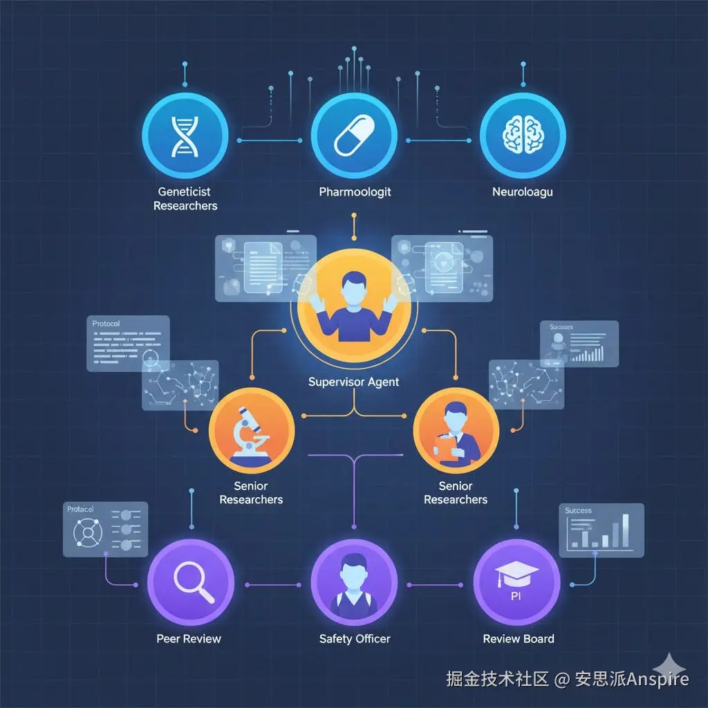 想象一下,有一个由AI科学家组成的团队在你的研究实验室里工作。其中一位专长于遗传学,另一位专长于药理学,还有一位资深研究员负责协调一切。而最吸引人的部分是:这个团队会从每一次实验中学习,并且每天都在进步。
