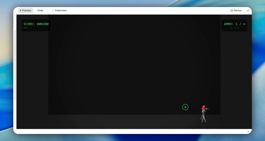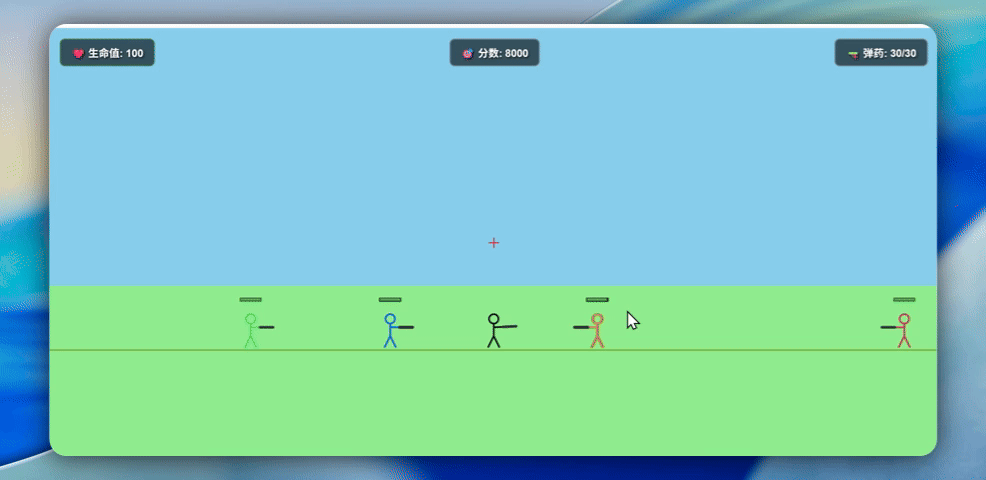 三分钟,代码生成完毕。我启动服务,打开浏览器,屏幕上确实出现了一个火柴人,手里也确实拿着枪,也确实能攻击周围的敌人。