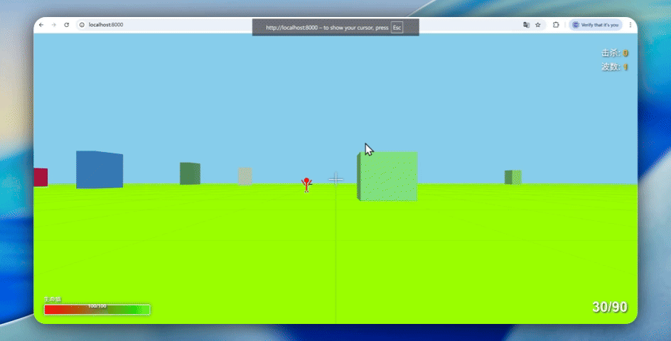 三分钟,代码生成完毕。我启动服务,打开浏览器,屏幕上确实出现了一个火柴人,手里也确实拿着枪,也确实能攻击周围的敌人。