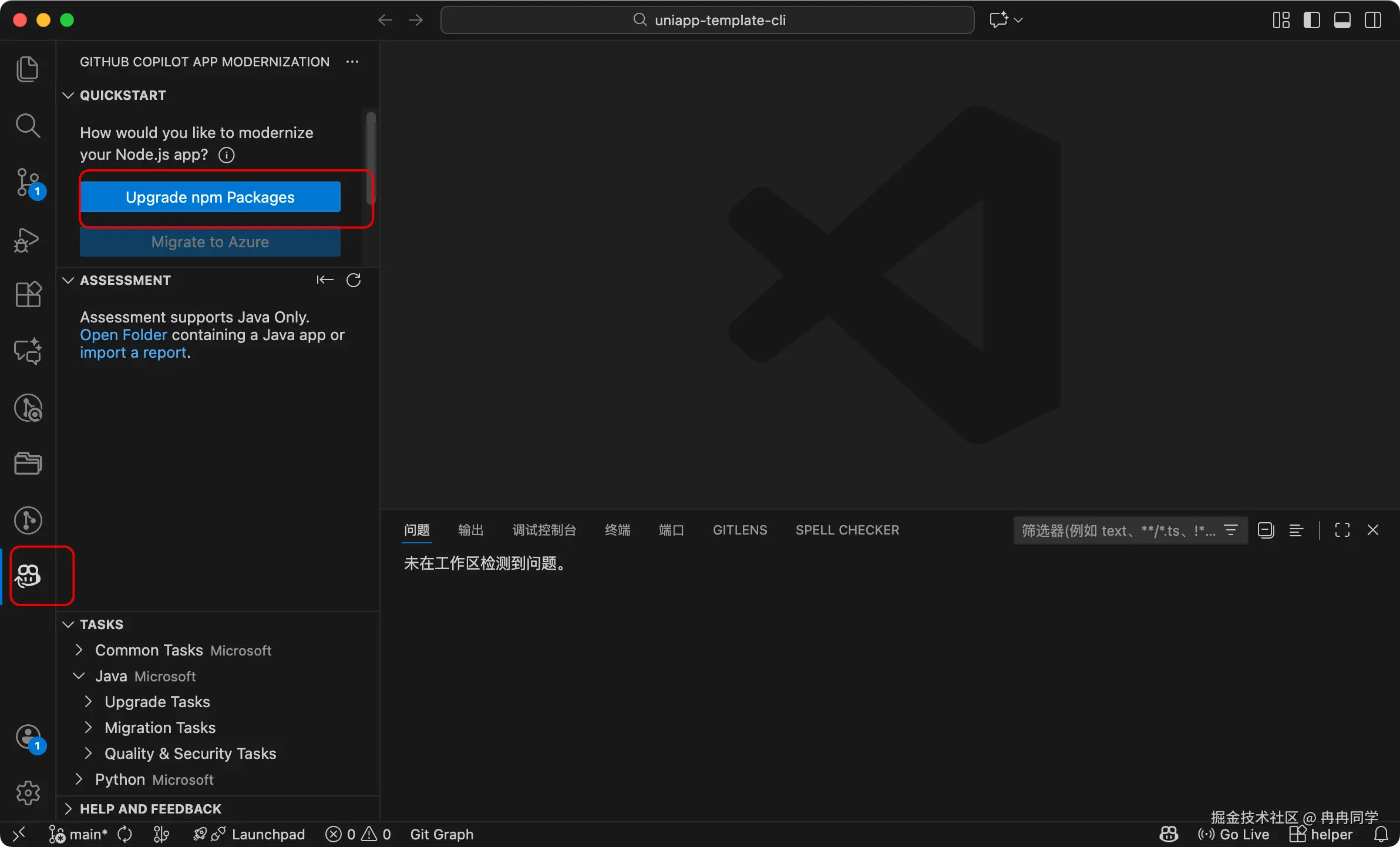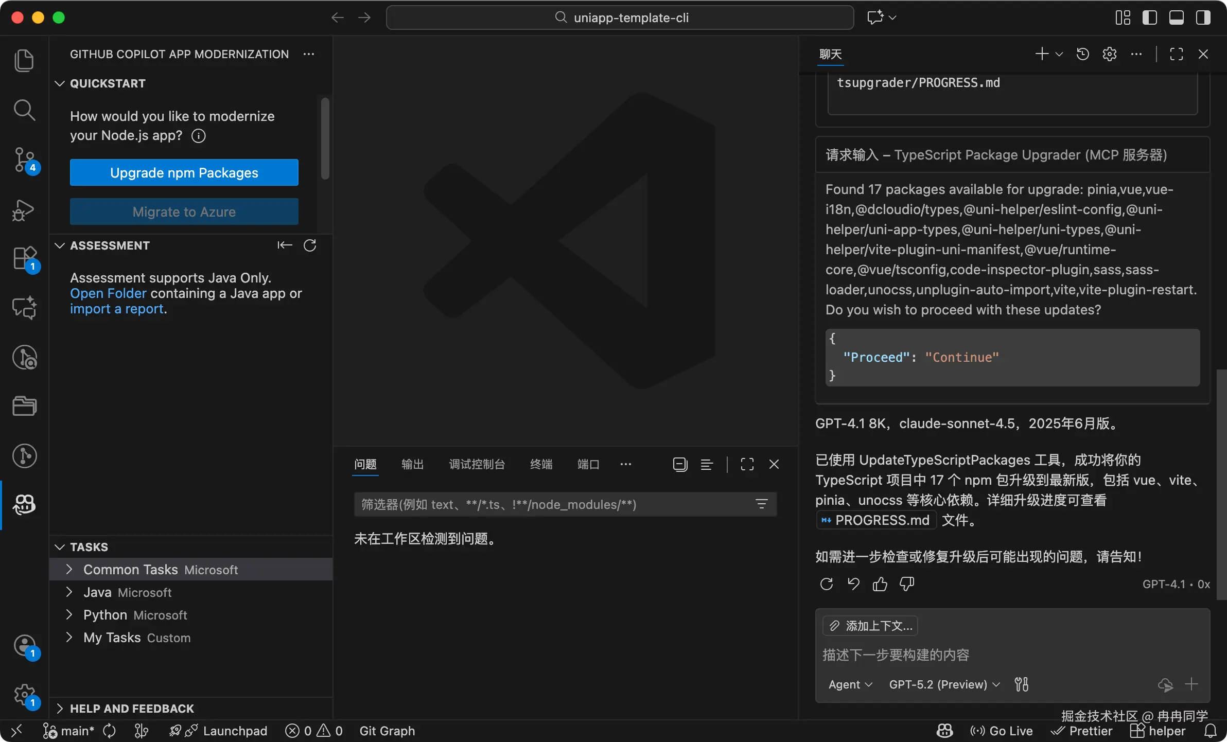 点一下 Upgrade npm Packages,剩下的都由 Copilot Chat 接管:它会读项目、给升级建议、确认后自动跑安装、甚至能帮你改掉因为版本升级导致的代码报错。