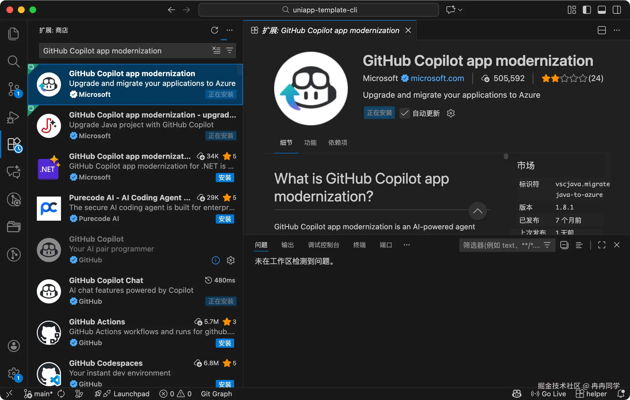 - 安装 GitHub Copilot app modernization 扩展。