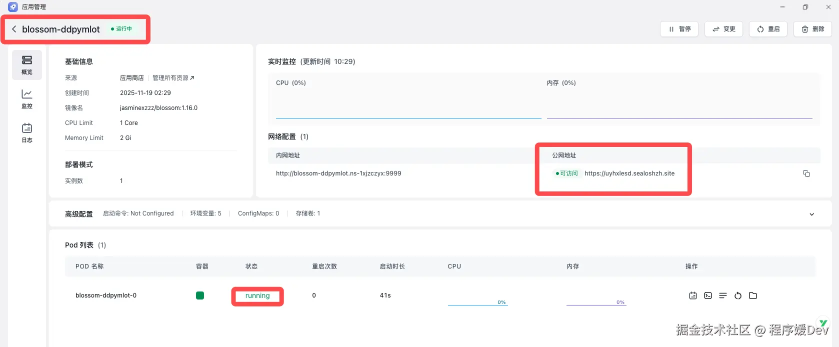 设置好密码后,点击右上角的“部署应用”。等待大约1-2分钟,看到状态变为绿色的 Running,你的高颜值博客就上线了。