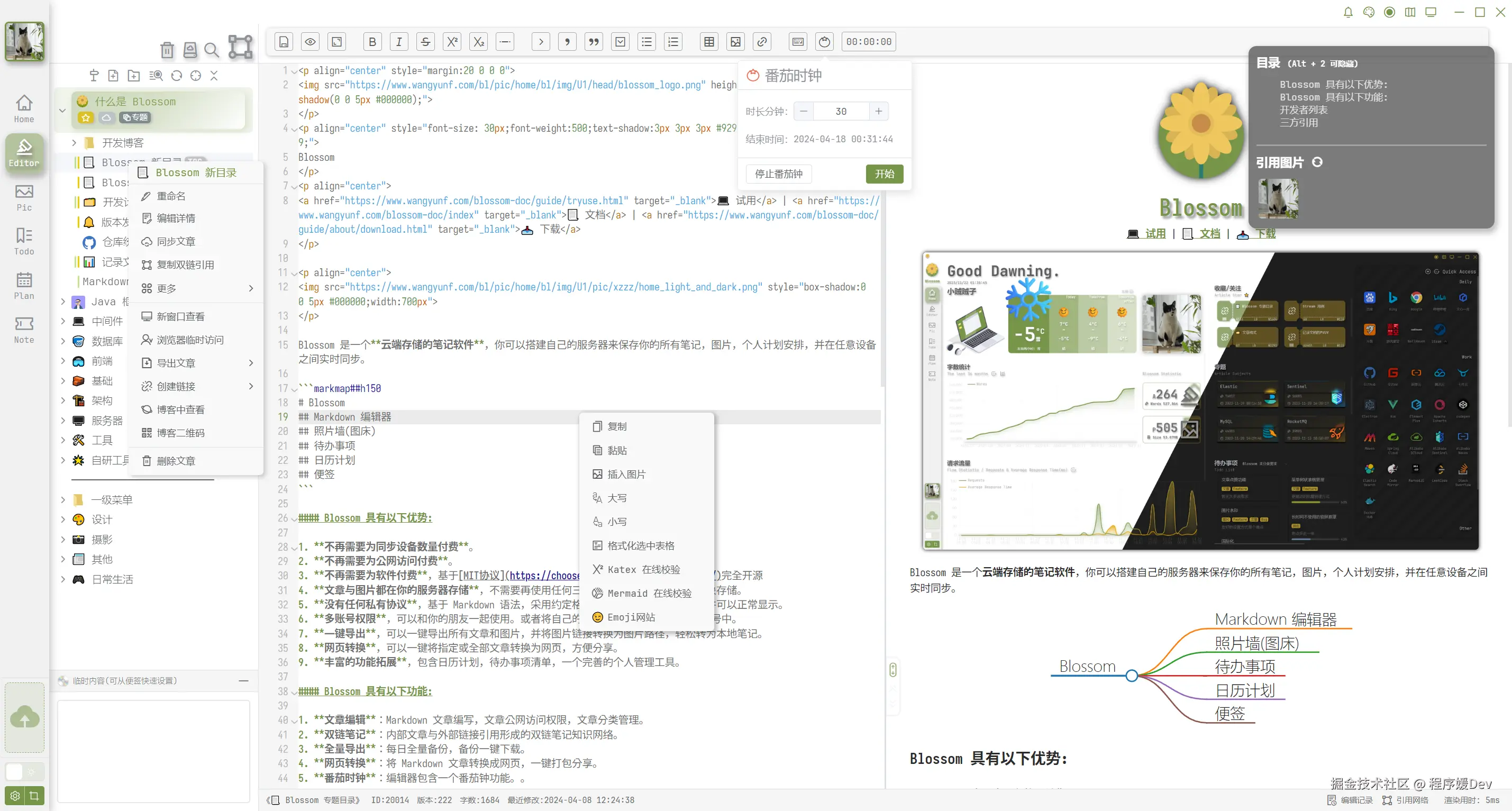 - 强大的编辑器:内置的Markdown编辑器功能非常丰富,支持流程图、思维导图、TOC目录等,几乎能满足所有写作需求。