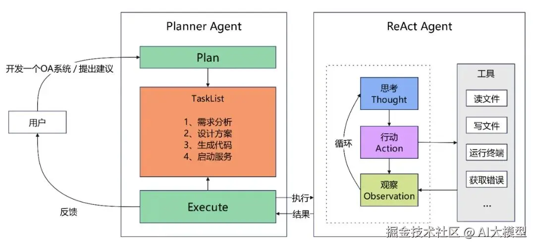 - 执行阶段:计划制定完成后(可能已采纳用户意见),Agent进入执行阶段。它会按照规划好的步骤逐一执行每个子任务。在执行每个子任务时,Agent可以采用标准的ReAct循环来处理该子任务的具体细节,例如调用特定工具、与外部环境交互、或进行更细致的推理。执行过程中,Agent会监控每个子任务的完成情况。如果某个子任务成功,则继续下一个;如果遇到失败或预期之外的情况,Agent可能需要重新评估当前计划,可以动态调整计划或返回到规划阶段进行修正,此阶段同样可以引入用户参与,允许用户对子任务的执行过程或结果进行反馈,甚至提出调整建议。
