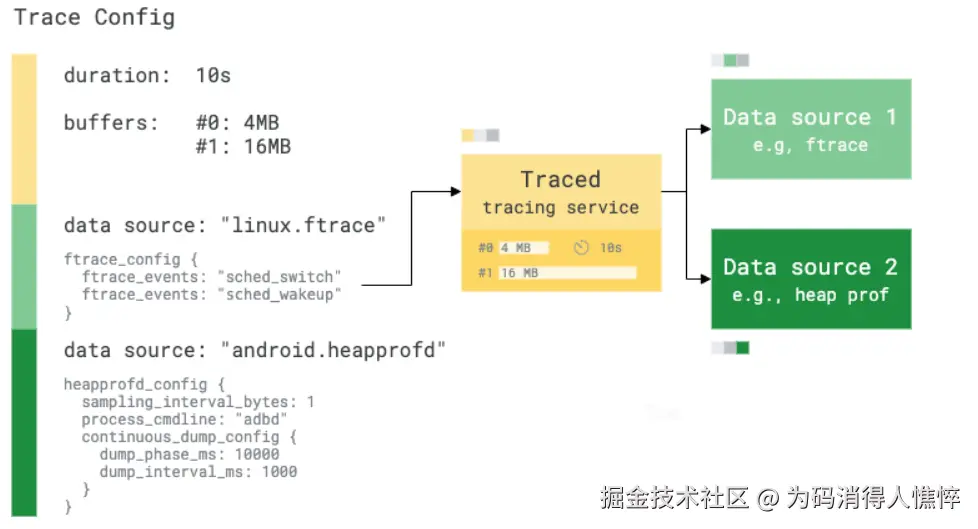 Perfetto 通过配置文件来定义要记录的数据。配置文件包含了跟踪项(如线程、CPU、内存)和其他设置。可以根据需要灵活配置,选择特定的事件进行跟踪。