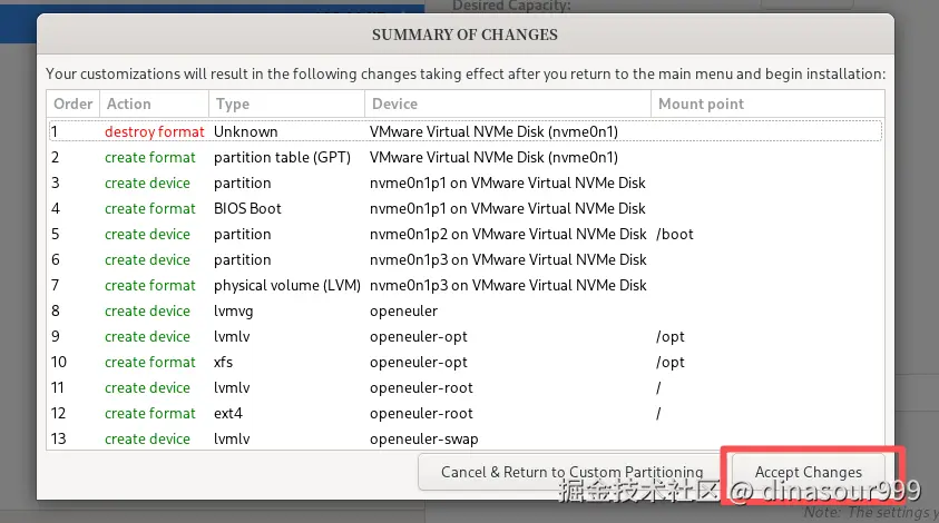 确认分区配置与需求一致后,点击 “Begin Installation” 开始安装。