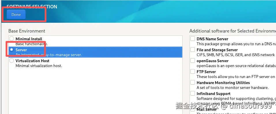 - 在 “Base Environment” 列表中,勾选 “Server” 作为安装类型,保持其他默认组件,点击 “Done” 返回。