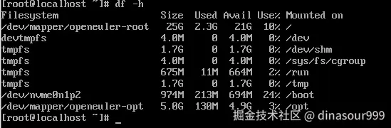df -h查看 /、/opt 分区的容量与文件系统。 - 执行