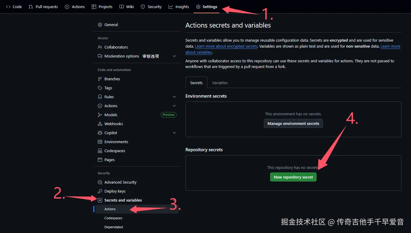 然后按照顺序点击 Settings -> Secrets and variables -> Actions->New repository secret