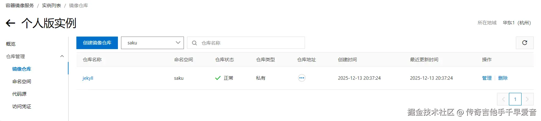 saku)和镜像仓库(例如jekyll-mirror)。 - 可选:把仓库类型设置为公开 (Public)。这样本地拉取时不需要配置 Docker Login,非常方便。