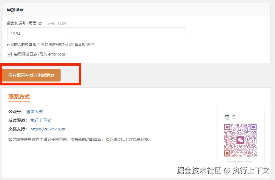 也可以配置留言的通知,填写你对应留言板的页面ID即可。填写后保存后你所对应的通道会收到一个测试消息来确保是否配置正确。