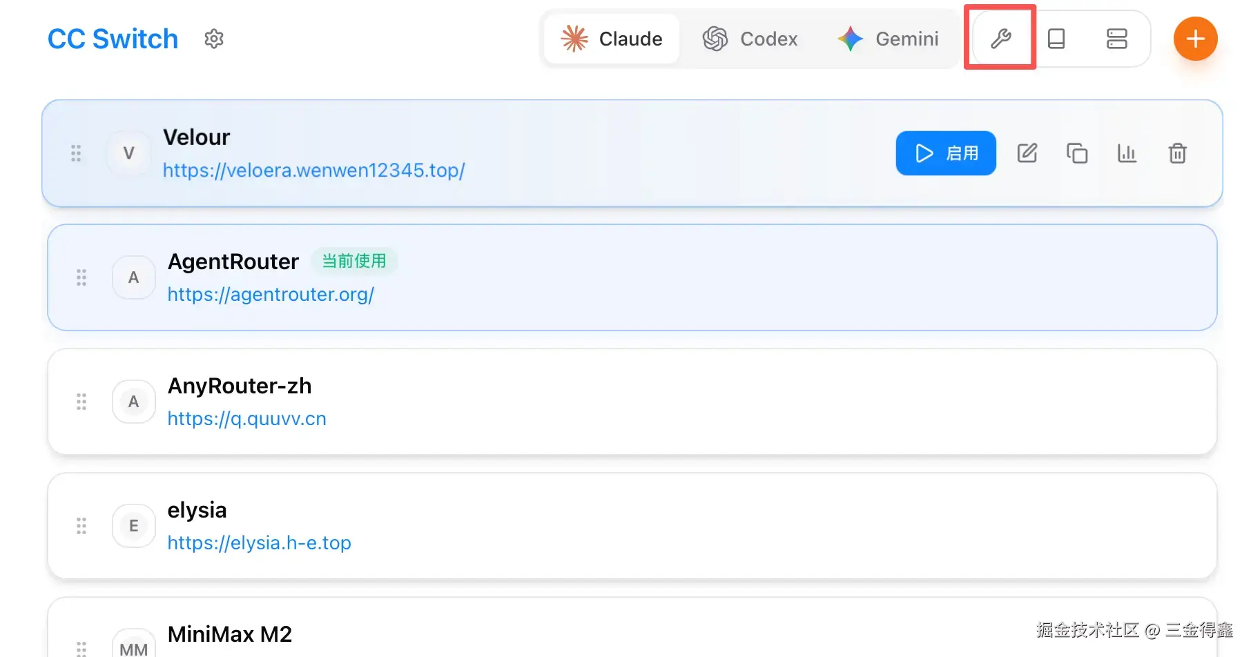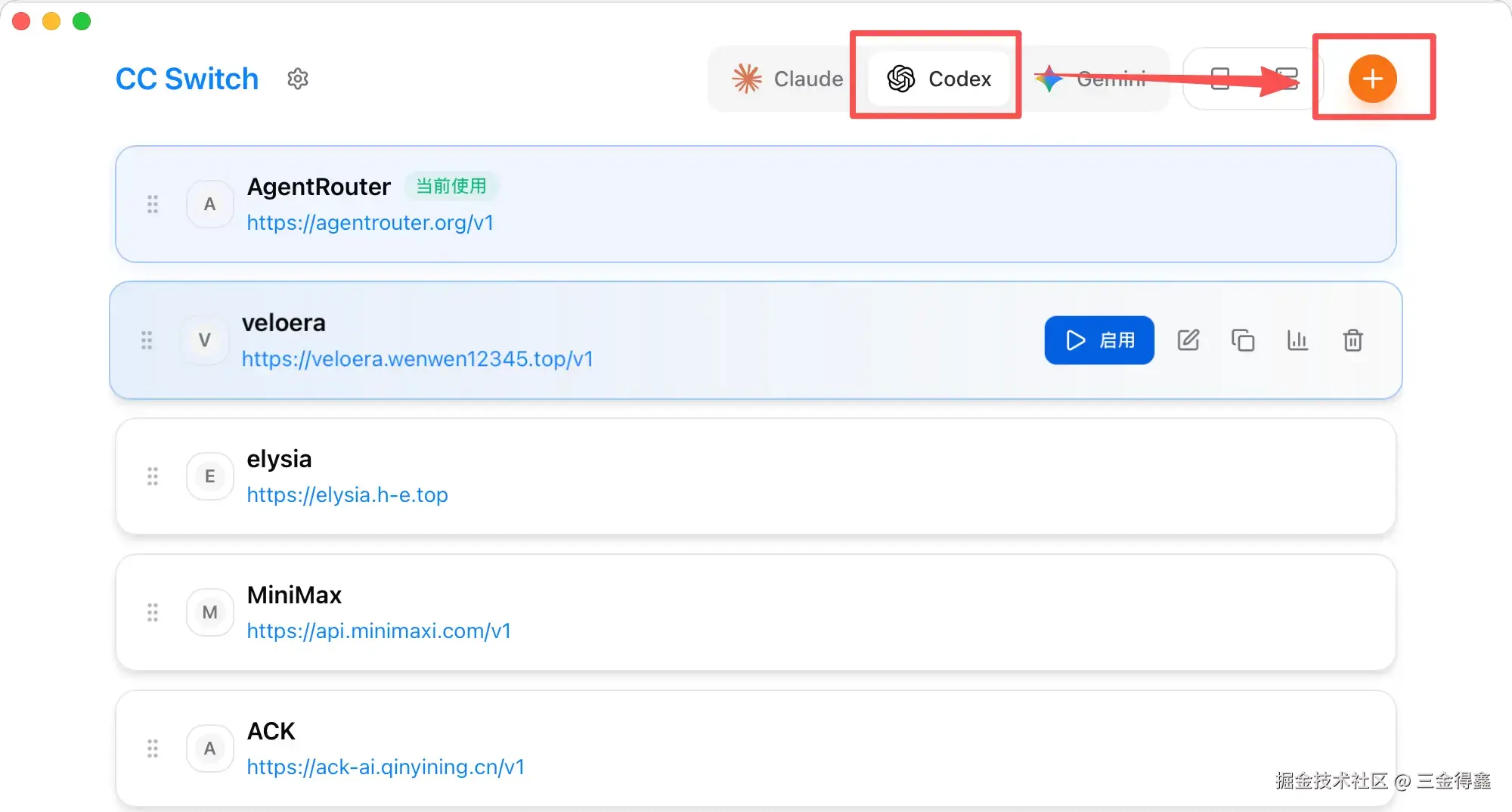 先选中要使用的工具,再点击右上角的橙色 + 号,即可进行 API 配置。我们以 Codex 为例: