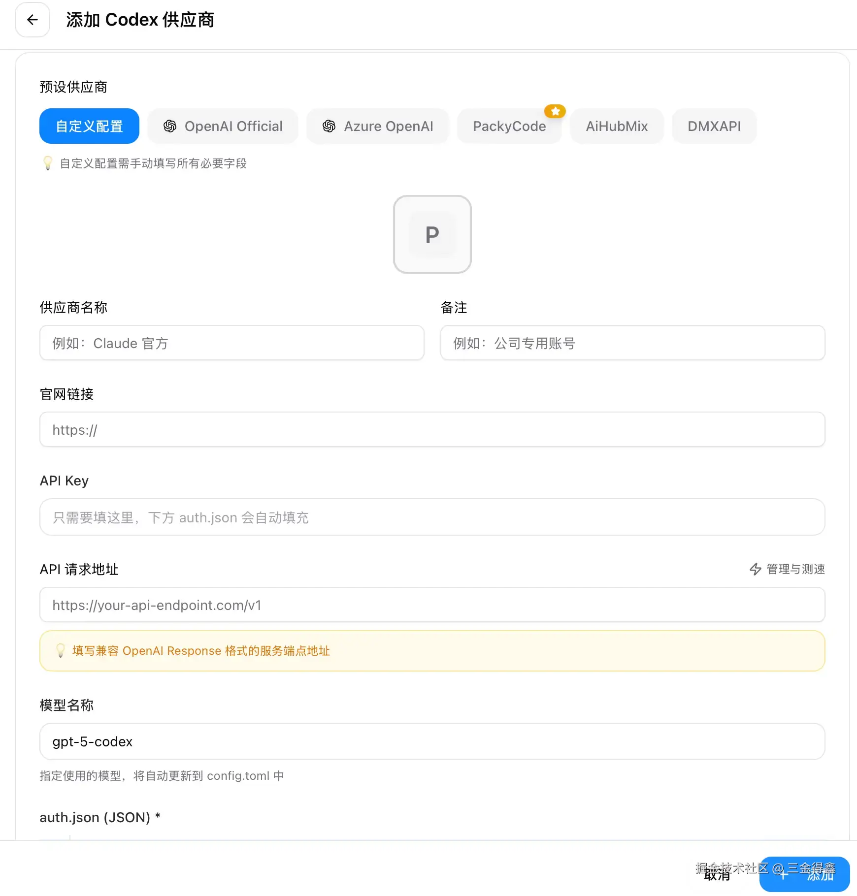 config.toml部分,修改 model 为最近大火的openai/gpt-5.2,model_reasoning_effort 配置可以改成 low 或者 medium(默认是 high,不但慢还费 token); - 最后点击右下角的添加即可。