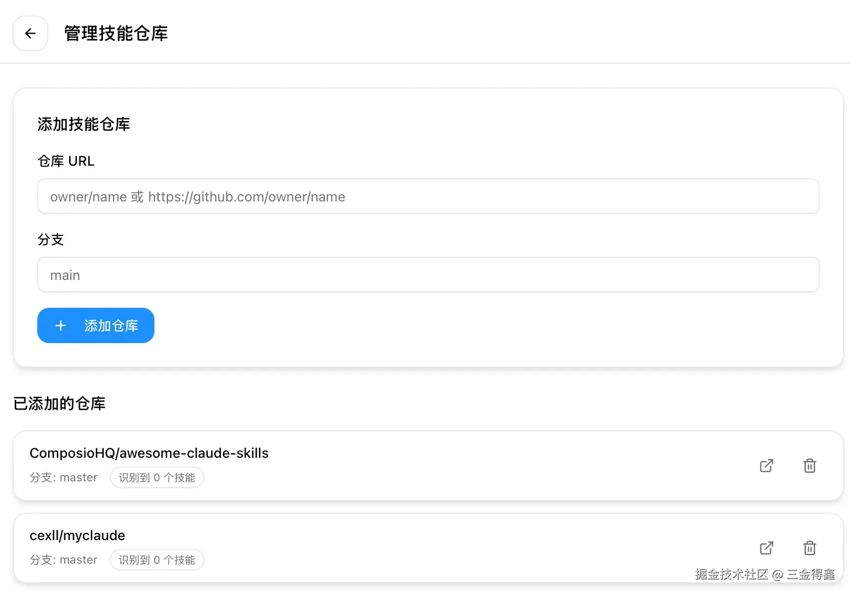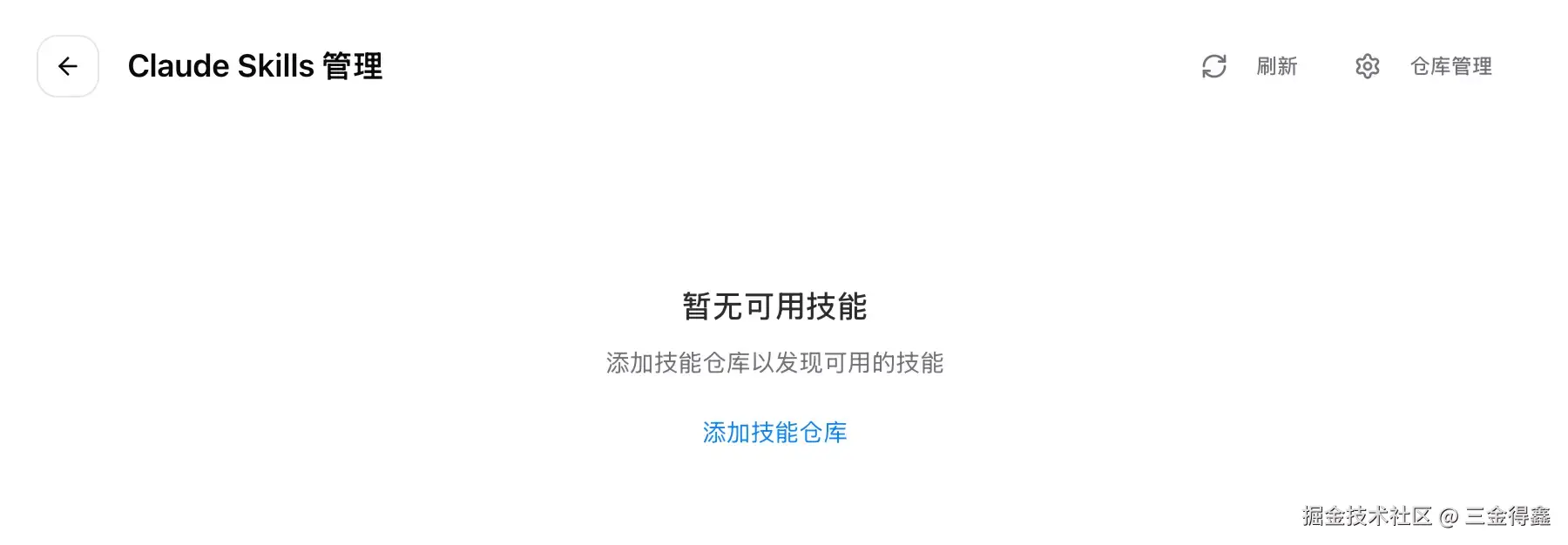 进入 Skills 窗口后,我们可以点击仓库管理配置技能仓库连接来添加配置 Claude Skills: