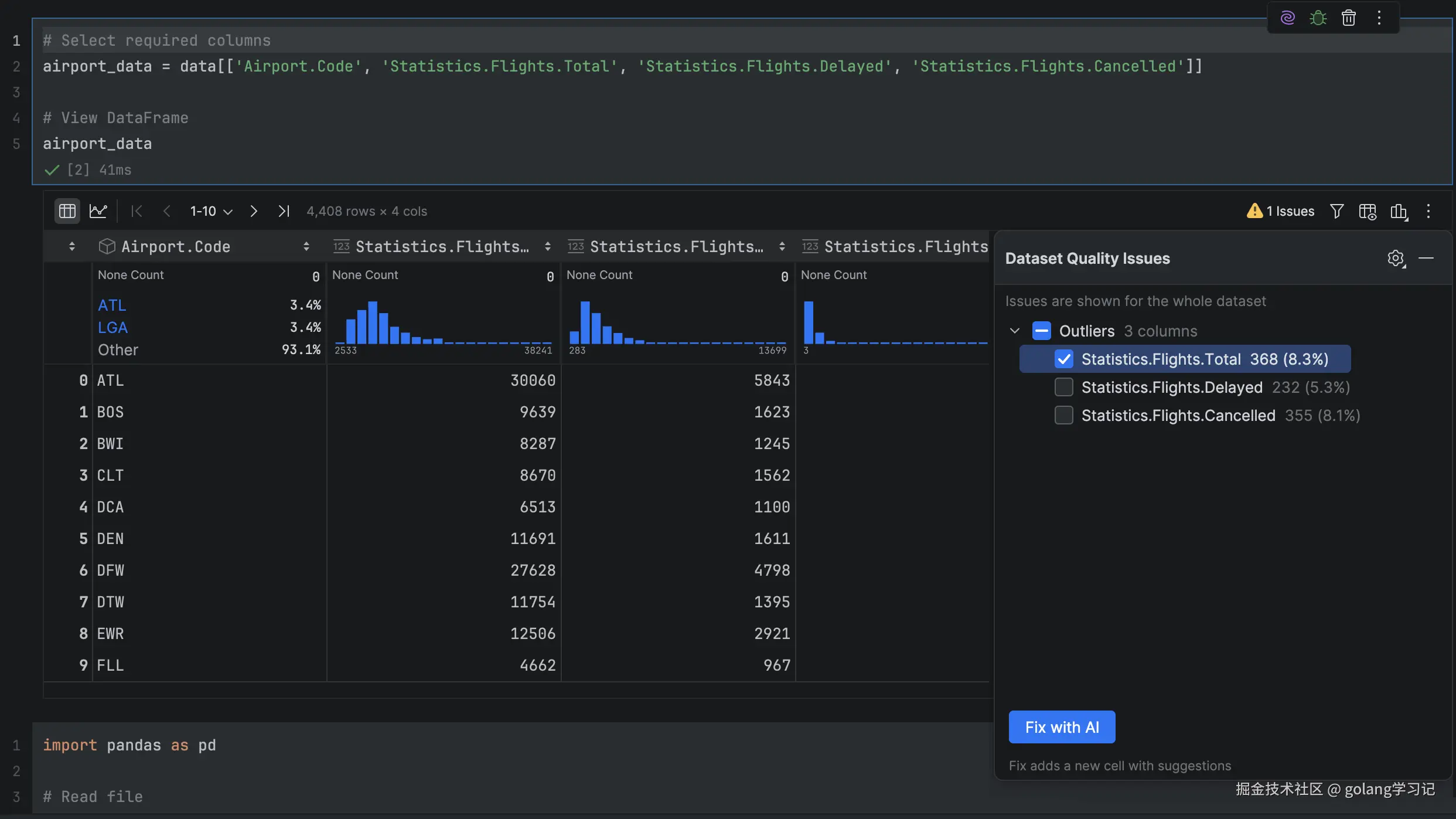 - ✨ 发现问题后,可点击 Fix with AI,自动生成清洗代码(基于 Junie 或 Claude Agent)