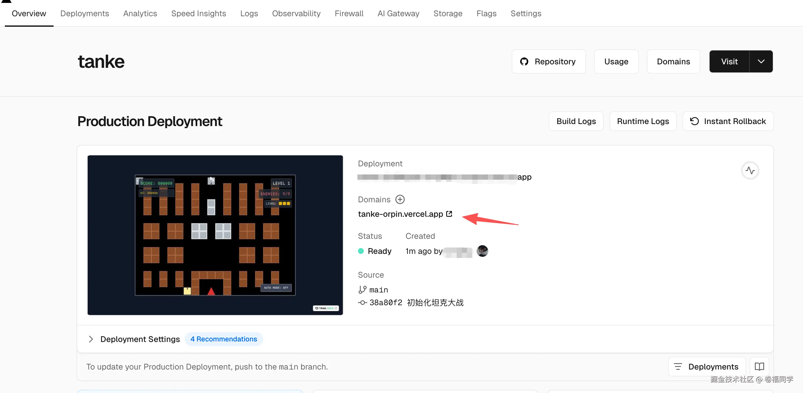 部署完成后,我们打开Vercel的页面,可以看到部署后的域名,直接浏览器打开就能开始玩了
