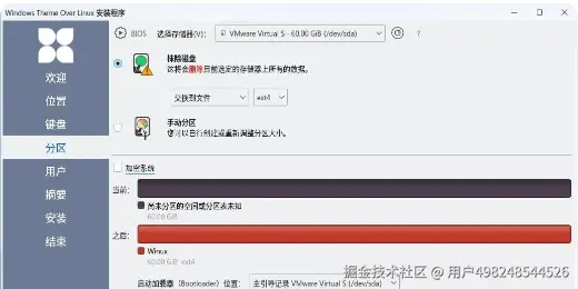安装过程中选择 “Install alongside Windows”,系统会自动识别并创建分区;
