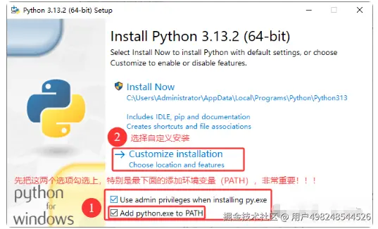 安装过程中,在这个界面,切记要勾选 Add Python.exe to PATH(关键步骤,否则需手动配置环境变量)