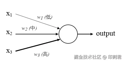 - 加权求和: 把每个输入乘以对应的权重, 然后加起来. 即 x1w1 + x2w2 + x3w3.;