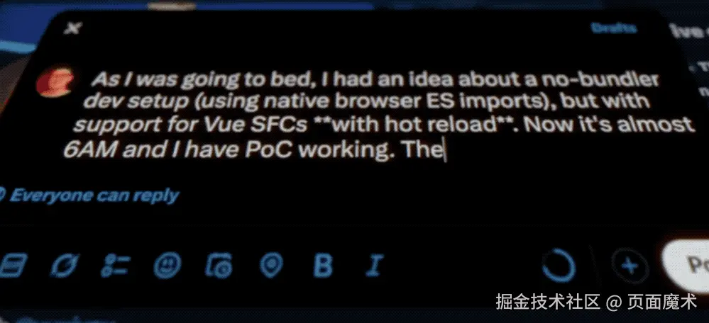 他觉得这玩意很有潜力,但当时的他还不确定该怎么做。直到 2020 年的 4 月份,他突然有思路了,于是他回到了办公室准备大干一场,结果这一干就干到了凌晨两三点。虽然第一版原型并不完整,但至少表明他的思路是对的,哪怕现在有个很大的 Vue 项目,点击保存之后也能在 100 毫秒内更新,而不是 5 秒以后才更新,这相当于 50 倍的改进。