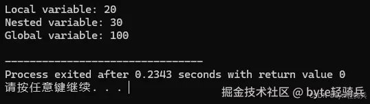 // 这是一个嵌套的作用域块 int nestedVar = 30;