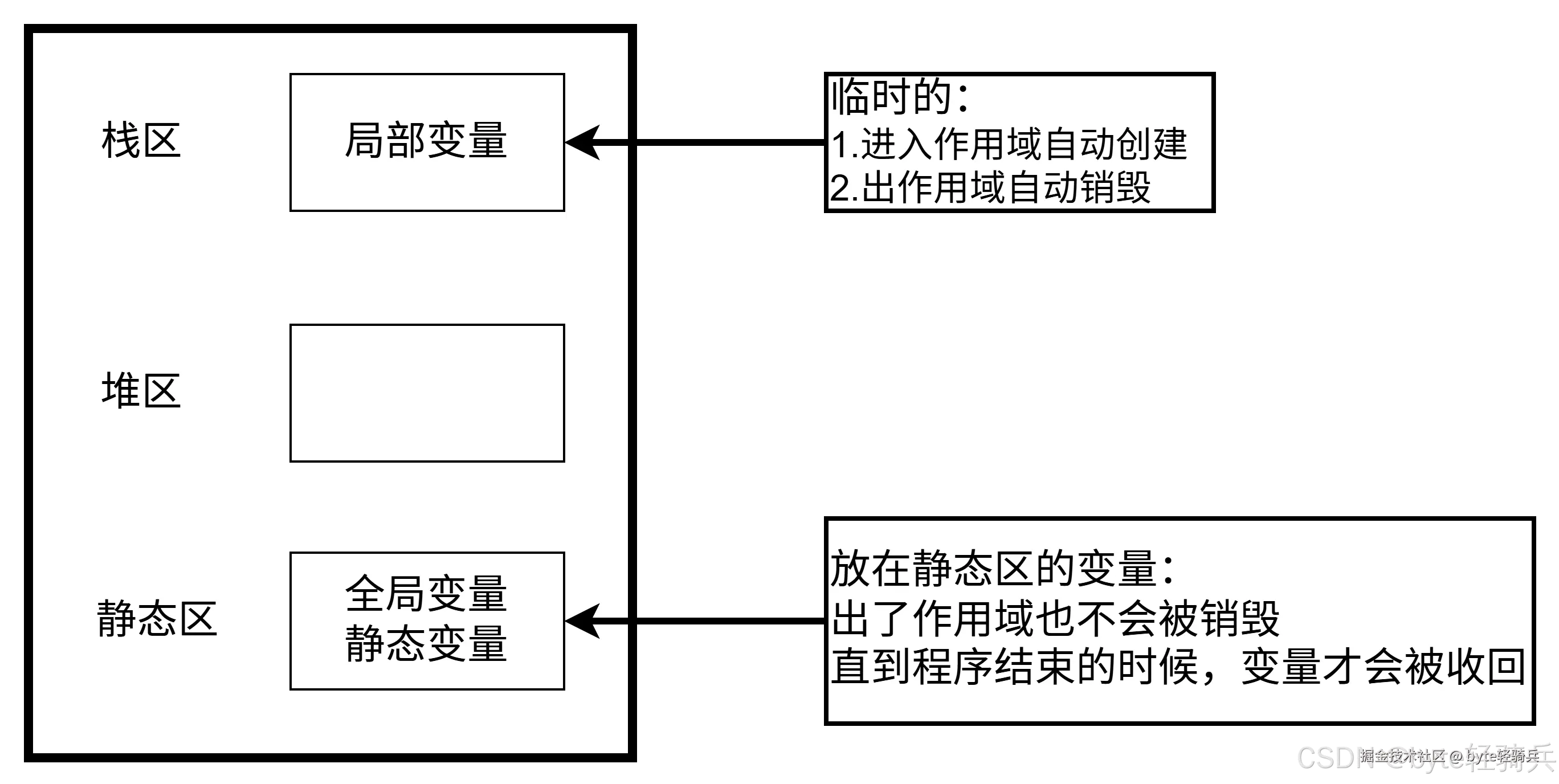- 全局变量在编译时分配内存,并在程序的整个运行期间都存在。