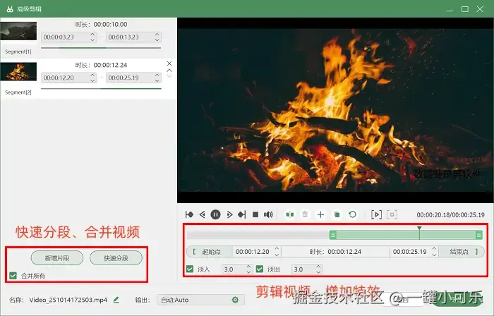 第3步:录完之后别急着关闭软件!还能解锁内置的 “高级剪辑” 工具。这里不仅能直接删减无用的视频片段,还能给视频加上精彩的转场特效。
