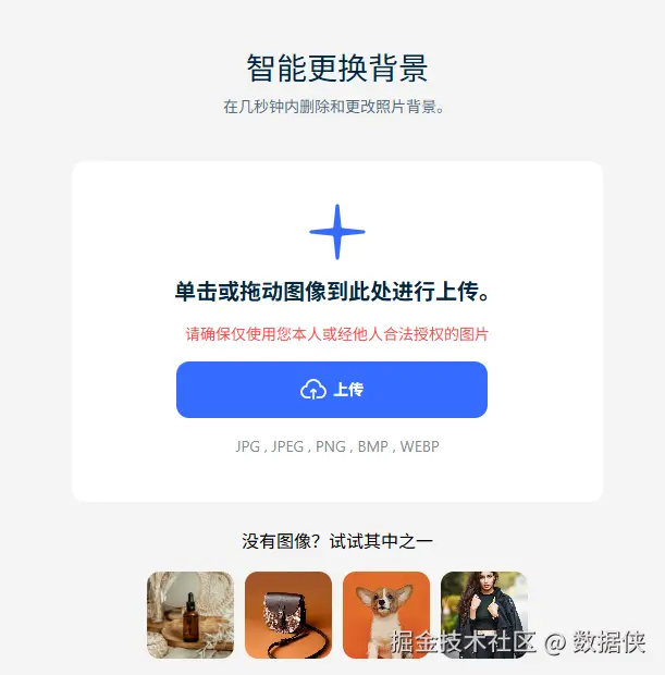 如果你想要在电脑上处理,又不想安装复杂软件,那么在线AI工具非常适合。这类工具通过AI抠图算法优化,复杂边缘处理优于普通手机 APP。推荐移乐AI背景更换,它提供多种背景模板,不仅能换背景颜色,还支持换背景图,操作很简单,无需掌握修图技能。 1.上传图片:将需要进行背景更换的图片上传到指定区域: