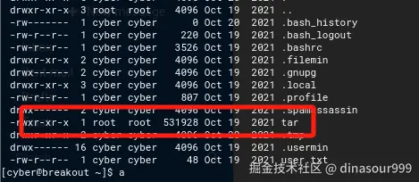 那就找有没有其他突破点,ls -la看一下发现有个所属root的文件tar,并且是有其他人可执行权限的