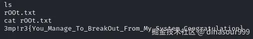ls看发现r00t.txt,cat得到FLAG{3mp!r3{You_Manage_To_BreakOut_From_My_System_Congratulation}}