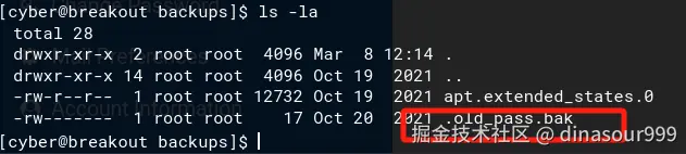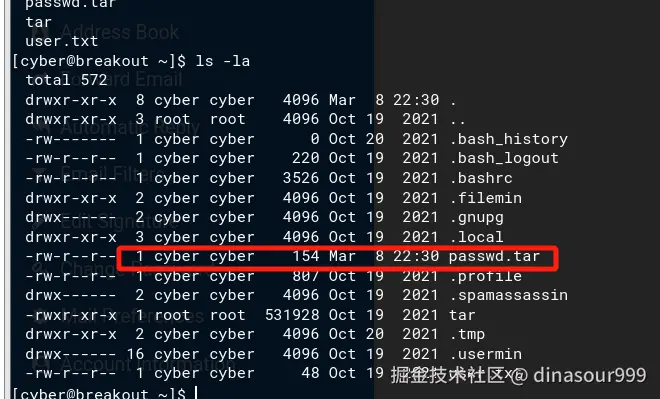 回到家目录,此时和前面发现的tar联合起来提权,可以使用命令./tar zcvf ./passwd.tar /var/backups/.old_pass.bak对文件压缩命名为passwd.tar