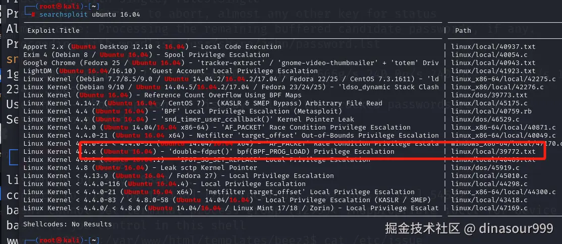 用命令searchsploit Ubuntu 16.04搜一下看看有没有该内核的提权漏洞,有一个39772的