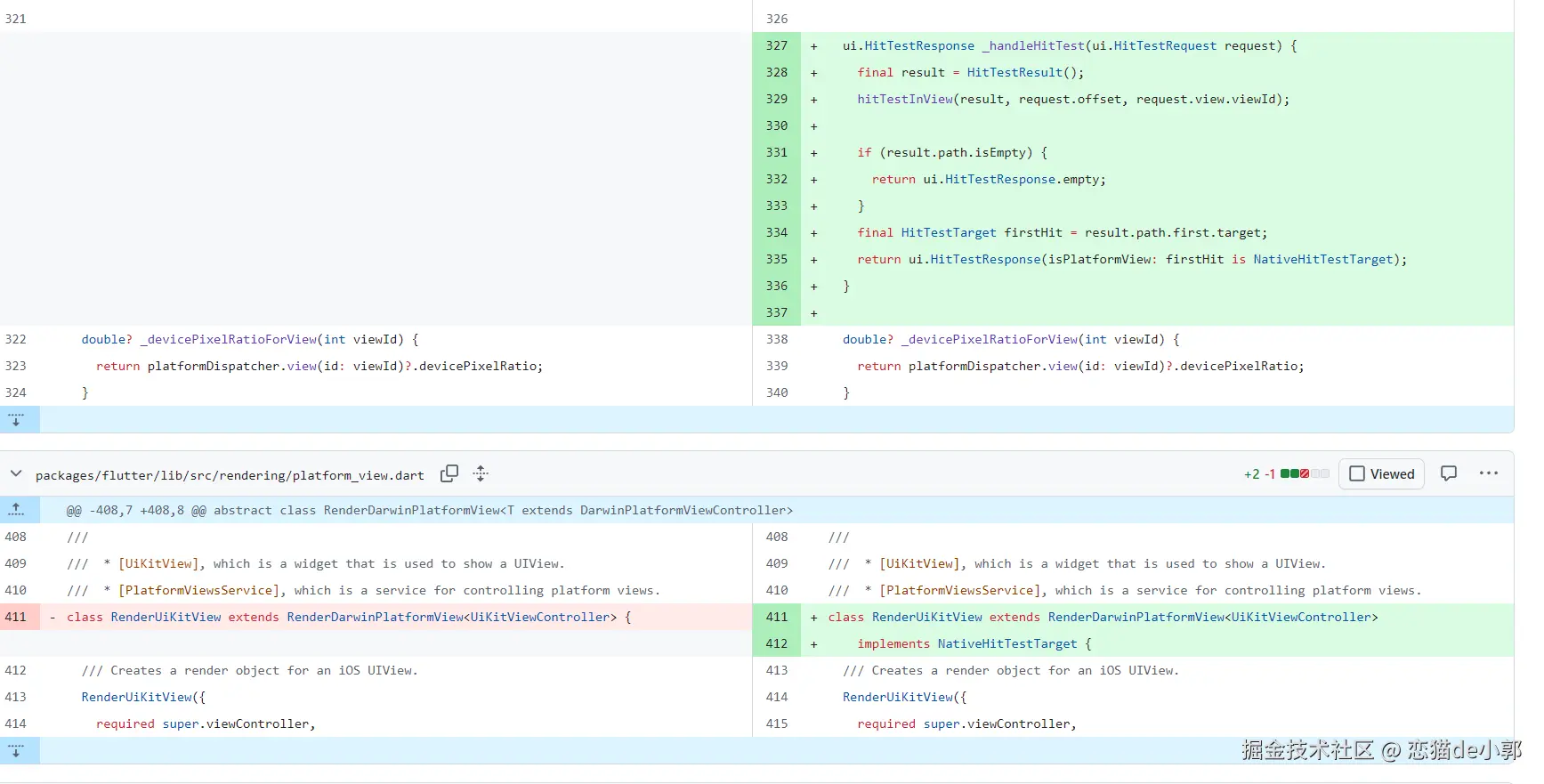 接着就是在 Dart Framework 层实现了 Hit Test 逻辑,用于响应 Engine 发起的命中测试请求,判断点击位置是否落在 PlatformView 上: