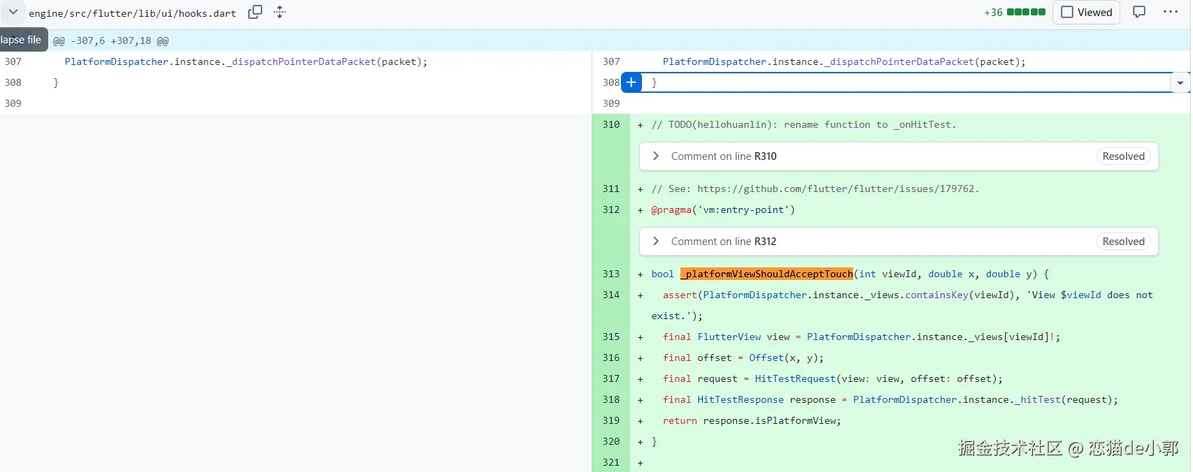 然后就是 Engine / Bridge 层的通信,这部分主要负责将 iOS 原生的同步调用桥接到 Dart 环境,这里提供了一个同步的 Dart 入口点 _platformViewShouldAcceptTouch,从而让 iOS 原生的 hitTest 方法可以阻塞等待 Dart 的判断结果: