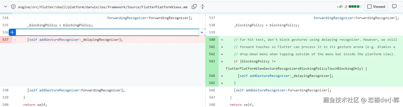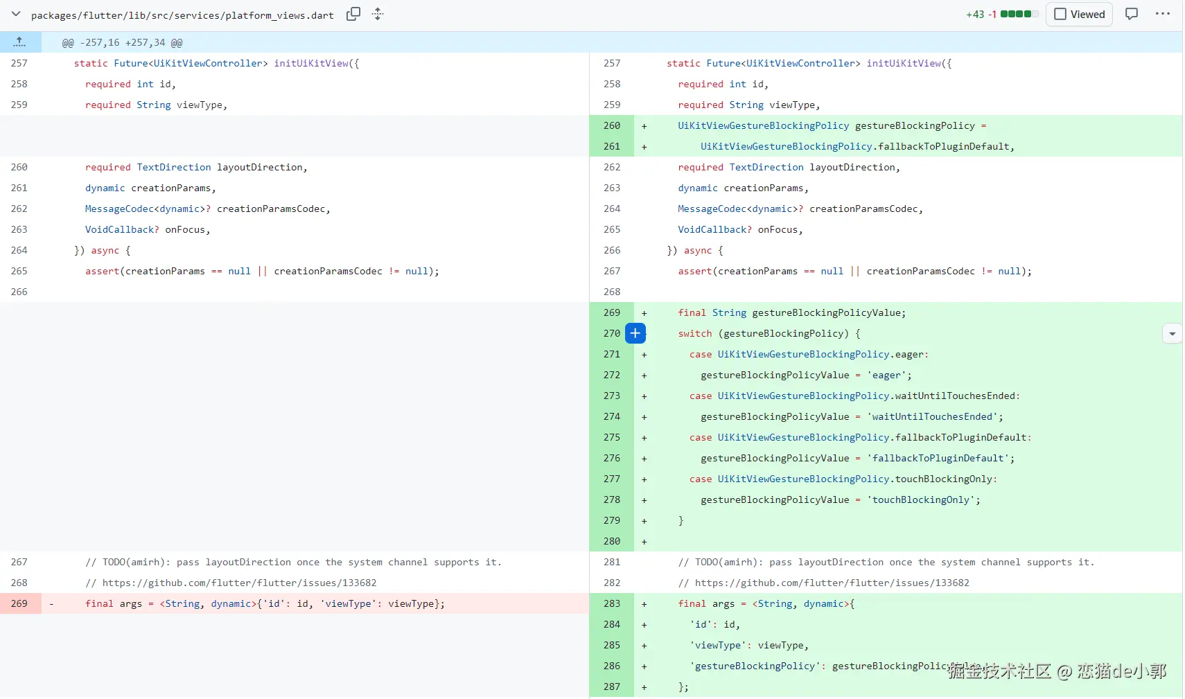具体来说就是,首先是 Dart Framework 层,这里新增手势拦截策略 API (UiKitView),在 UiKitView 组件中新增了 gestureRecognizersBlockingPolicy 参数,让开发者可以为每个 PlatformView 单独配置手势拦截行为:
