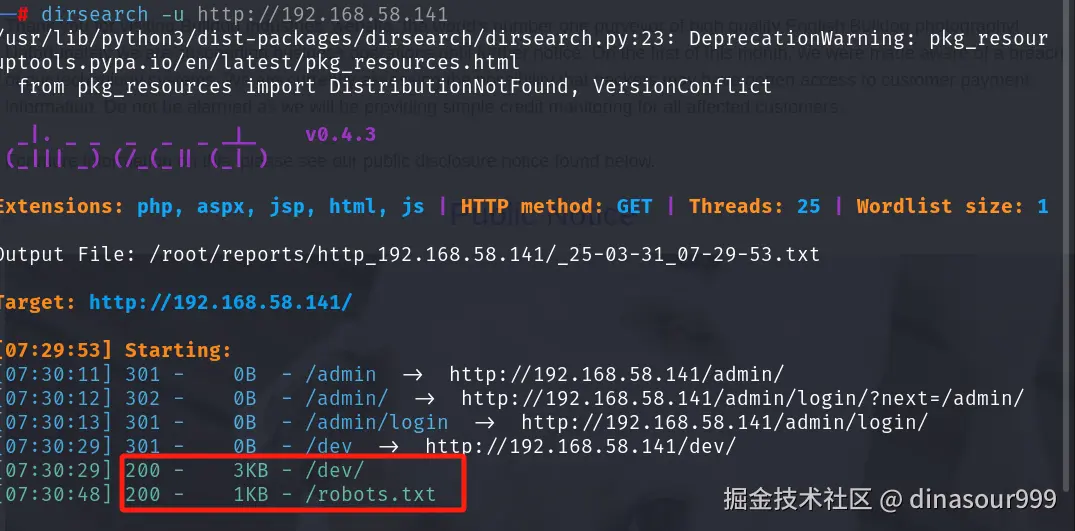 进行详细扫描,没什么新发现,再用dirsearch扫描下目录,发现有个robots文件和dev文件夹,还一个admin的登陆界面